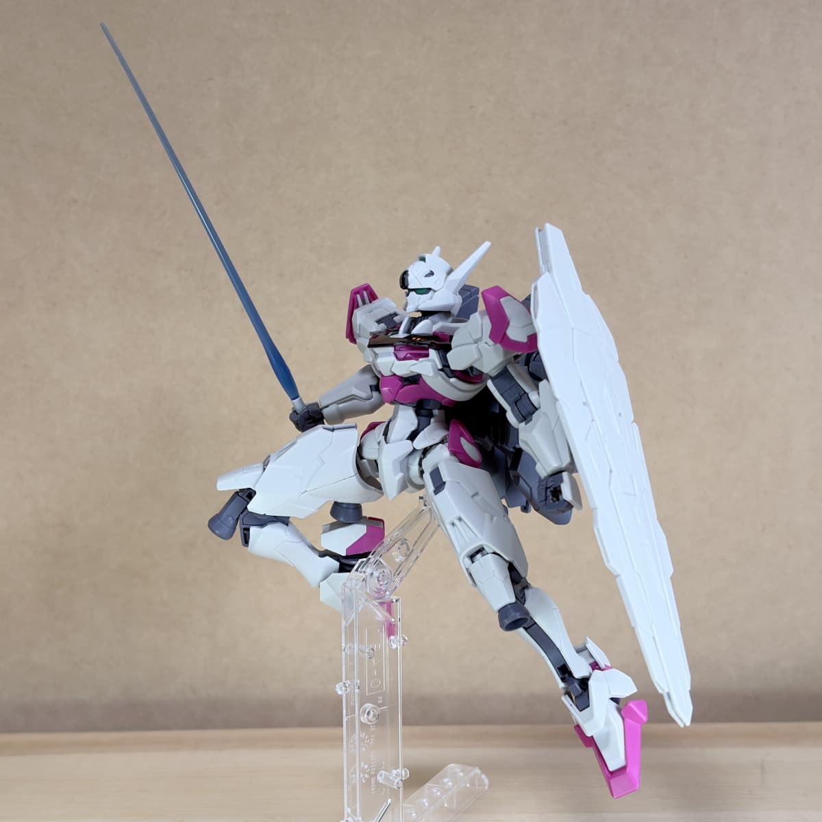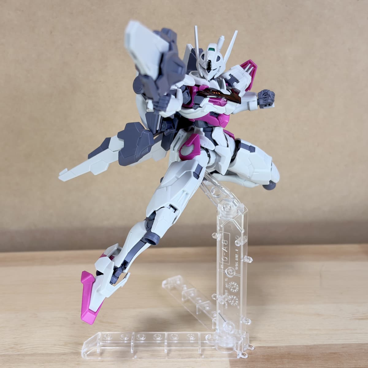可動域は凄いですねぇ、その証拠が膝立ちと言っても良いくらい動いてくれます。ルブリスより前に発売されたキットでは、写真の様な膝立ちはできないかもしれません。機体の安定感は足の裏の接地性の高さだと思います。