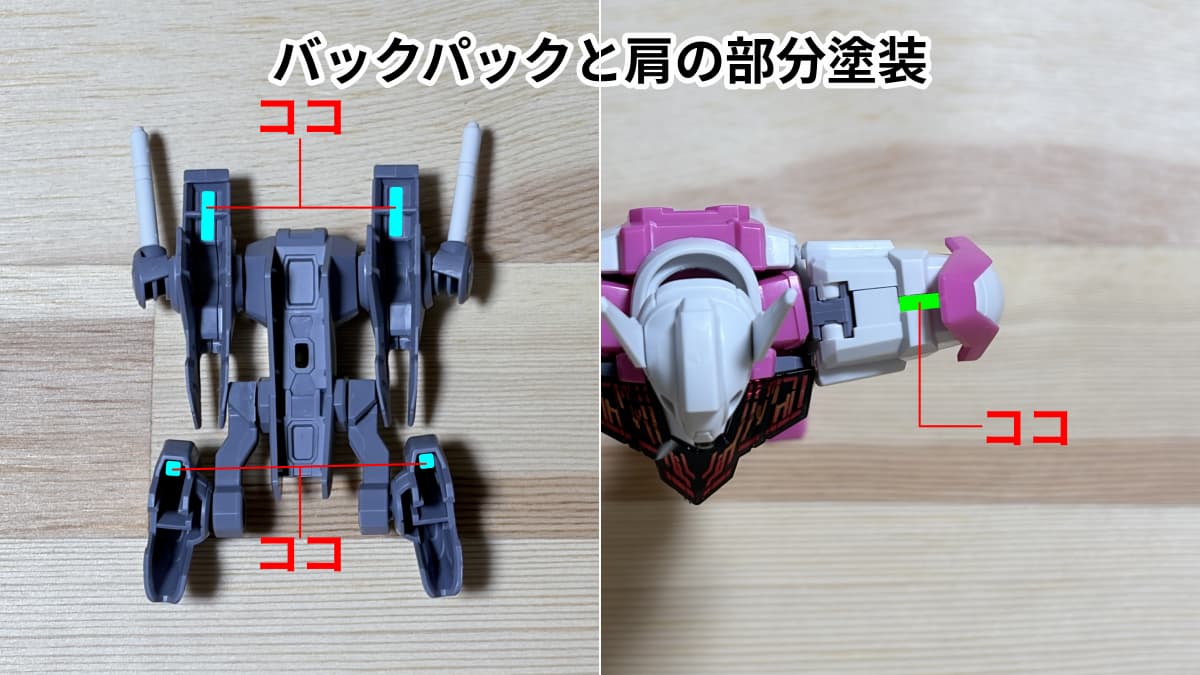 肩のピンクの外装、腰のピンクの外装、足の裏の先のピンクの部分、足首の円筒状のグレーの部分、バックパックのサーベル収納部分、連結アームにあります。