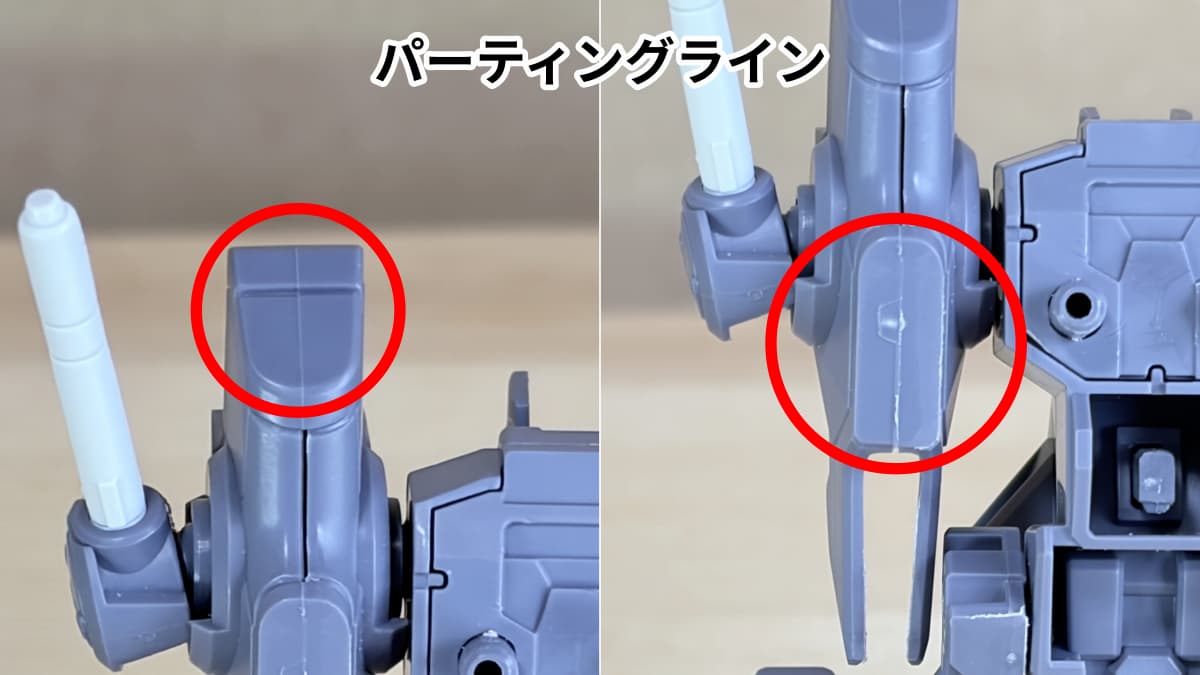 アニメ本編ではバックパックと脇の下の装甲にこのラインが存在しません。レシーバーガンはグリップ付近が見えないので確認できませんでした。